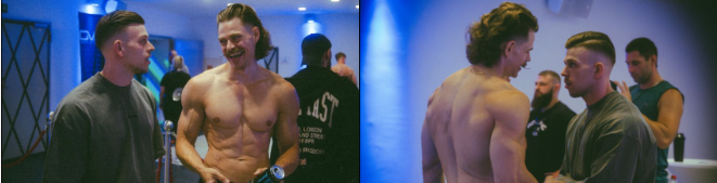 Ich pumpe beim Warten weiter. Nach kurzer Zeit gehen wir in den offiziellen Warm Up Bereich, wo das Pumpen weitergeht. Liegestütze, Rows, Kurzhantel Curls, Trizeps Extension, Side Raises usw. der ganze Oberkörper wird aufgeblasen. Das einzige, wo ich pure Erholung möchte, sind die Beine. Dann heißt es ‘Noch 1 Minute!’, ich droppe auf den Boden und baller weiter Liegestütz bis mir dicke Kabel bzw. Google Maps auf meinen Armen erscheinen.